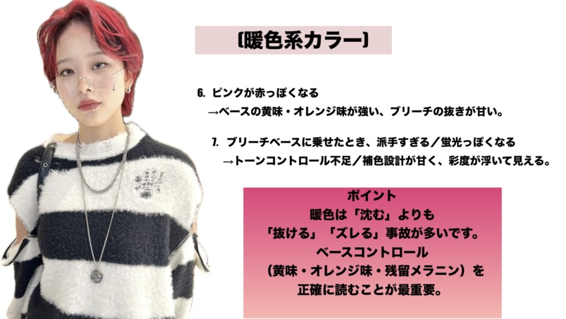 一回のブリーチでできる色味が多いので、ブリーチ初心者の方やカラーが初めての方にも提案しやすい色ですが、失敗が起こりやすい難しいカラーです。