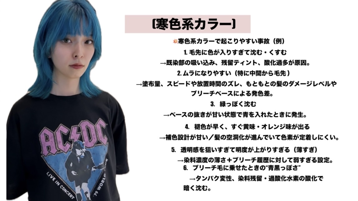 まず、寒色系は透明感も出やすく人気なカラーですが、見極めを少しでも失敗してしまうとムラができてしまったりするので、とても繊細なカラーです。