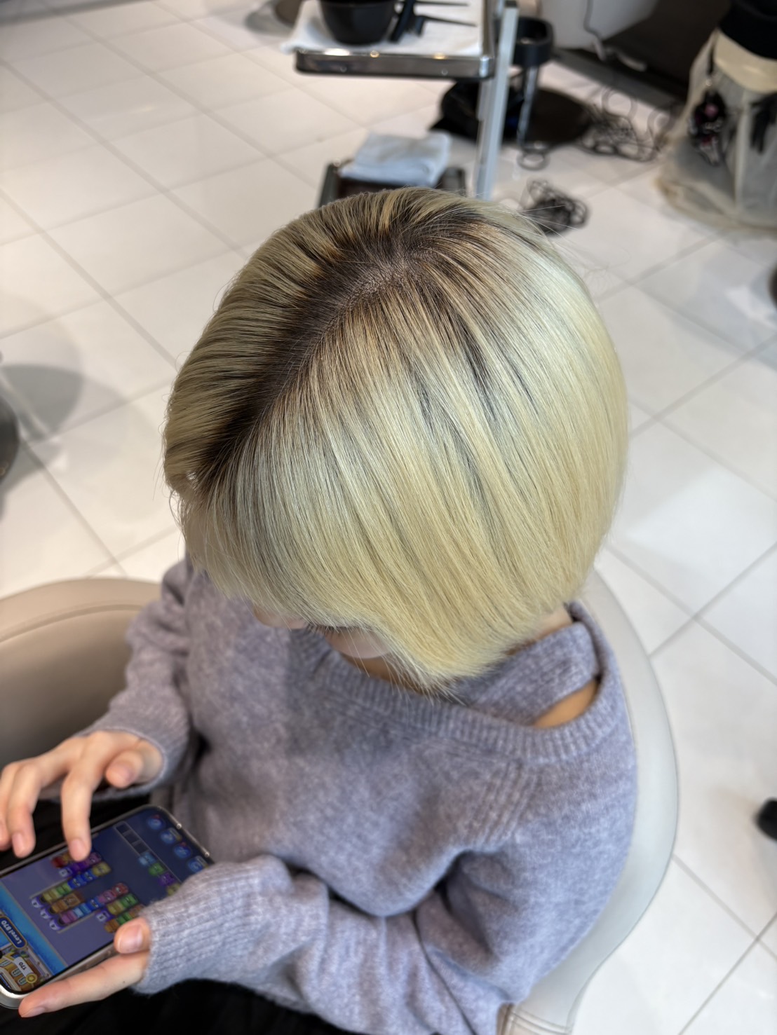 ゼロテクといっても、体温の影響でリフトしやすい頭皮ギリギリを開けておくので、5mm程度のオレンジ味の部分ができ、次回リタッチをする時の髪の体力を残すことが可能です。