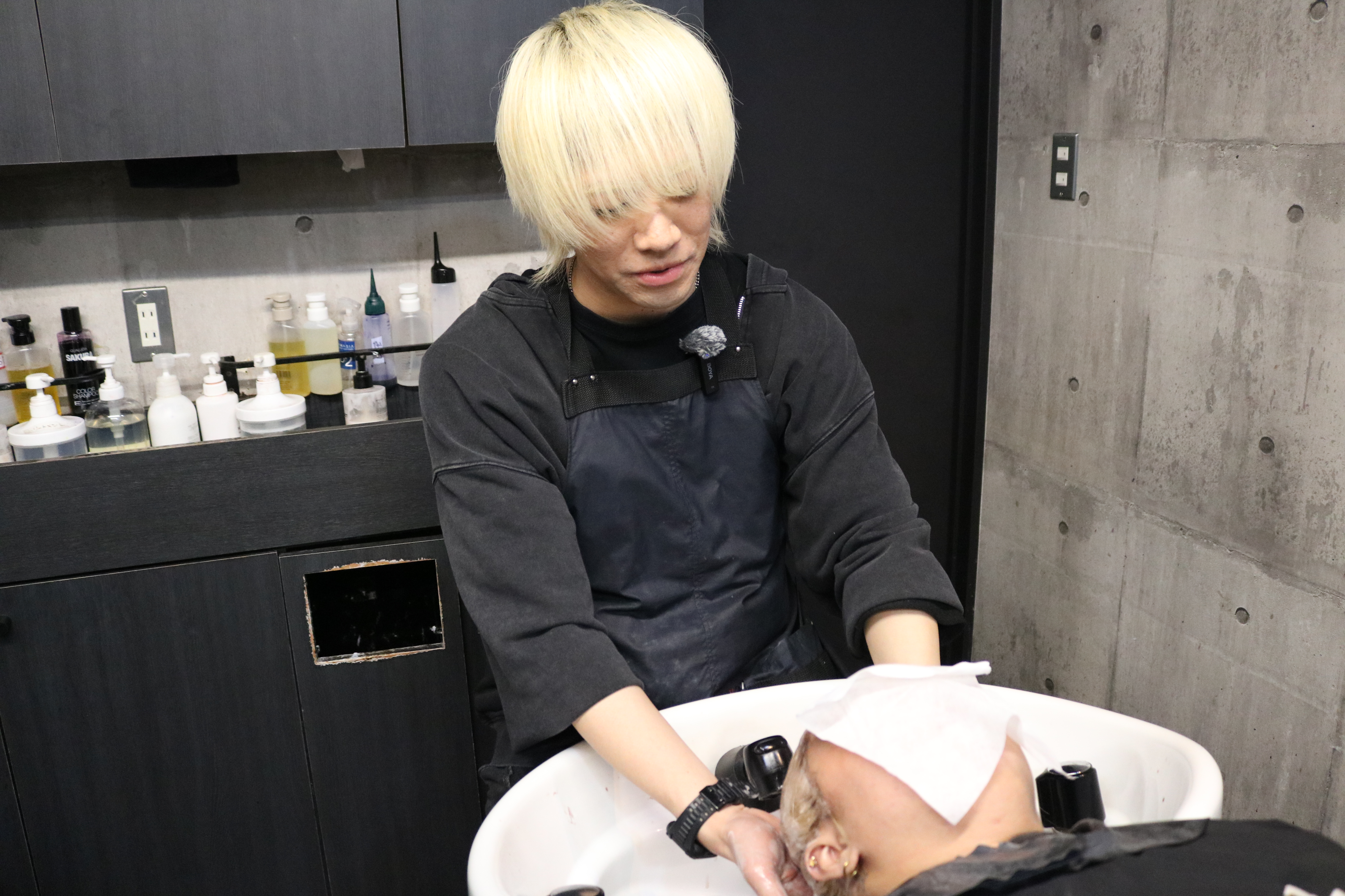 シャンプー台でベースを作ったときに使った薬の残りで、軽くトナーします。淡く入るぐらいで良いので、乳化するような感じです。この後、シャンプーします。