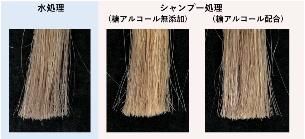 図1.ヘアカラー退色抑制試験 洗髪後の毛髪(左から、水処理、糖アルコール無添加シャンプー処理、糖アルコール(加水分解水添デンプン)配合シャンプー処理)