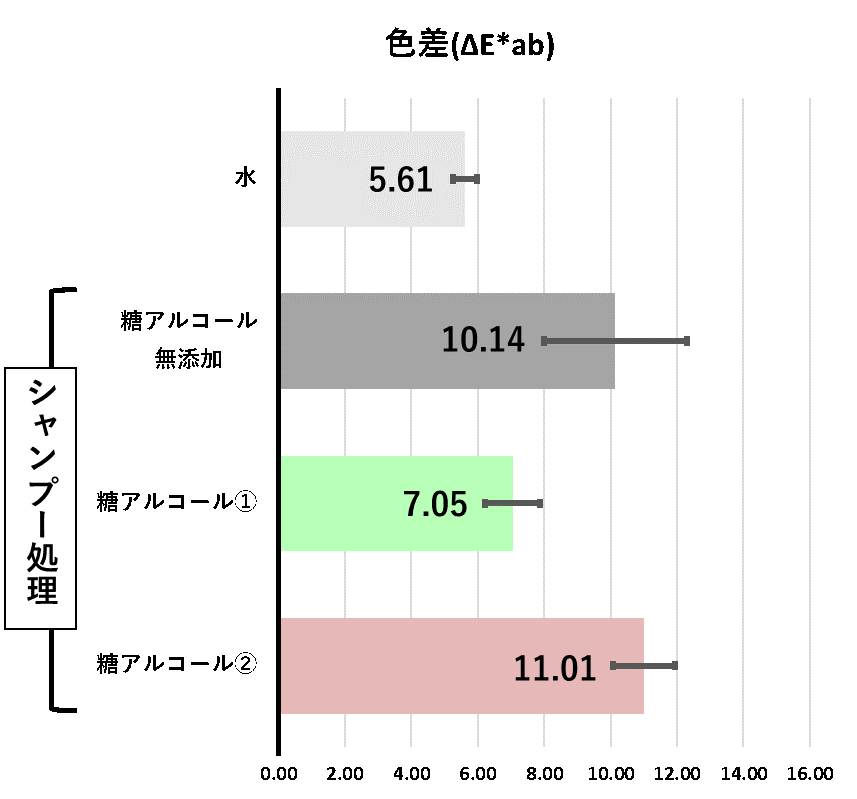 ブリーチ毛に対し、市販染毛剤(赤系)にてヘアカラーした毛髪を水または糖アルコール配合有無の各シャンプーを使用して、洗髪および乾燥を行った。ヘアカラー直後と洗髪後に、分光光度計を用いて360nm~780nmの波長の透過率を測定し、L*a*b*値に変換し色差(ΔE*ab)を算出した。