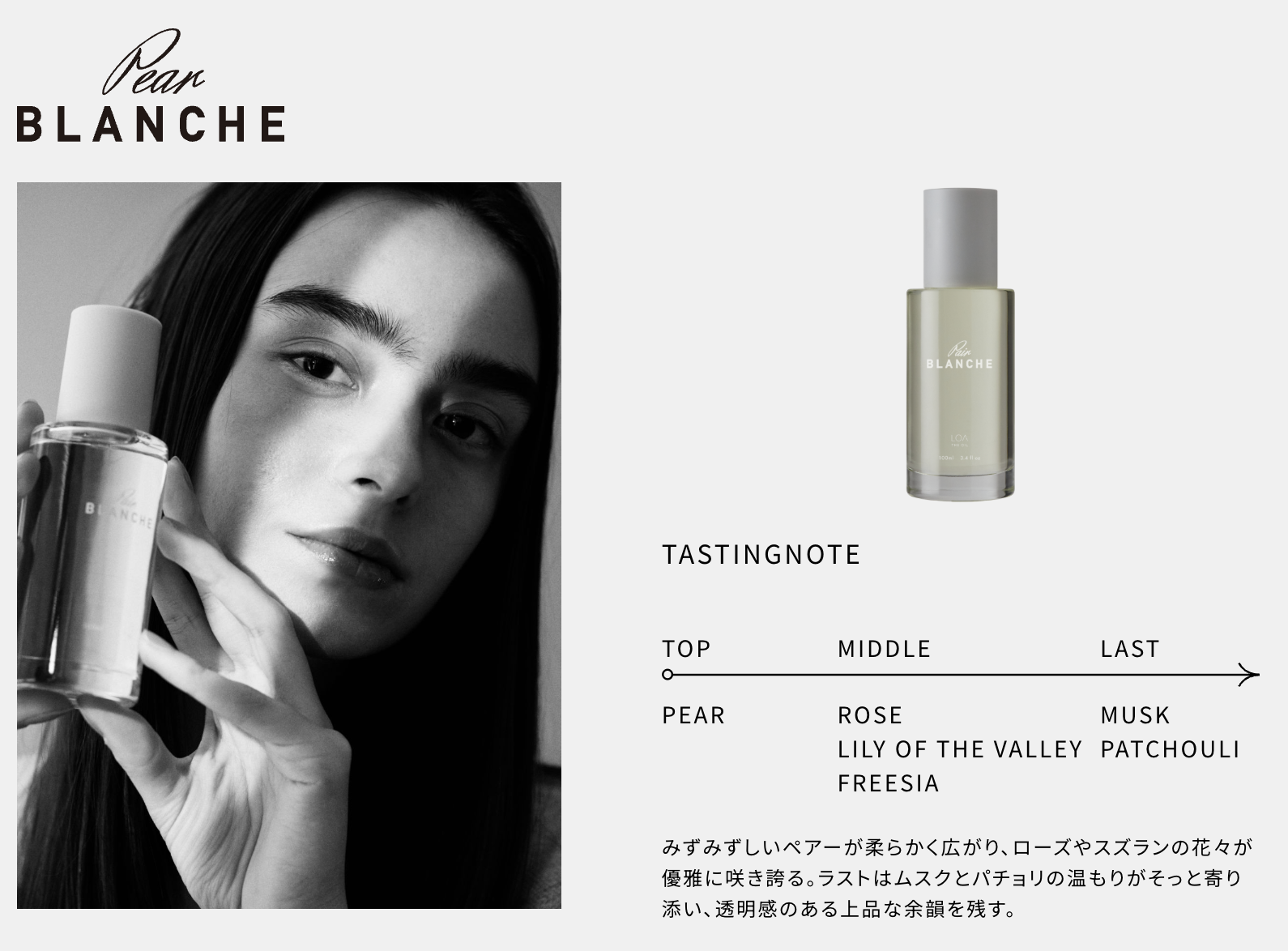 柔らかく広がるみずみずしいペアーに、ローズやスズランの花々が優雅に寄り添う軽やかな香り。